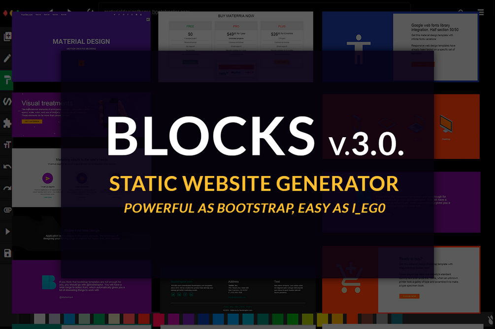 BLOCKS is a simple to use static drag-and-drop website generator with lots of features. Ready-made responsive templates and blocks, material design palette, Google fonts, inline style editor, php contact form, eye catching modern design and plenty of features to simplify web site creating